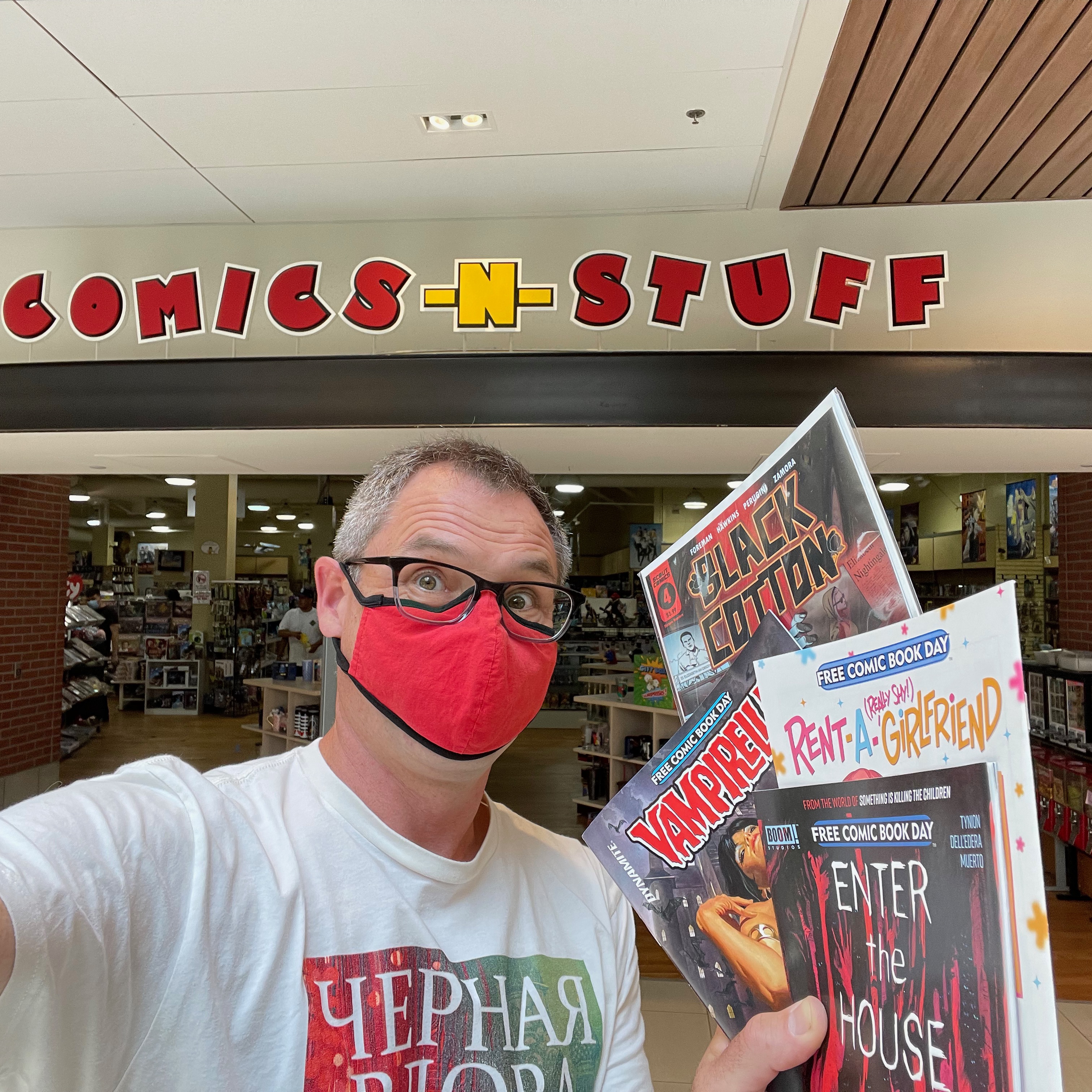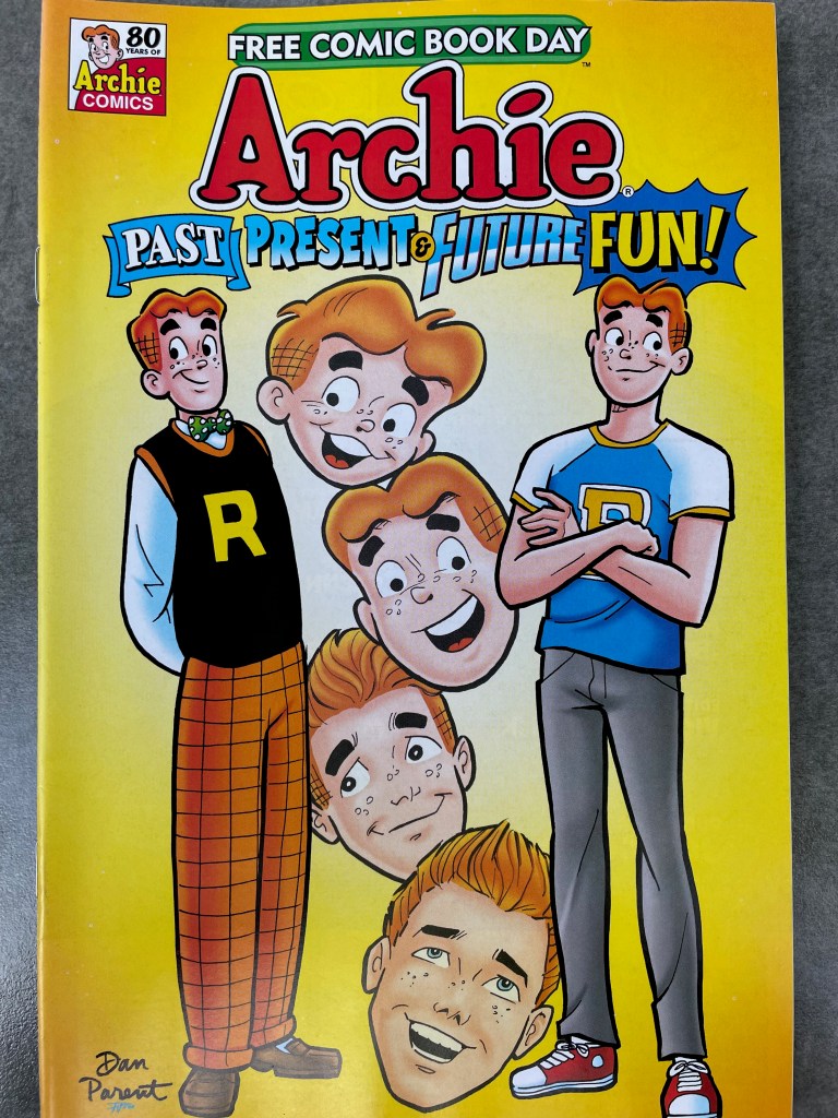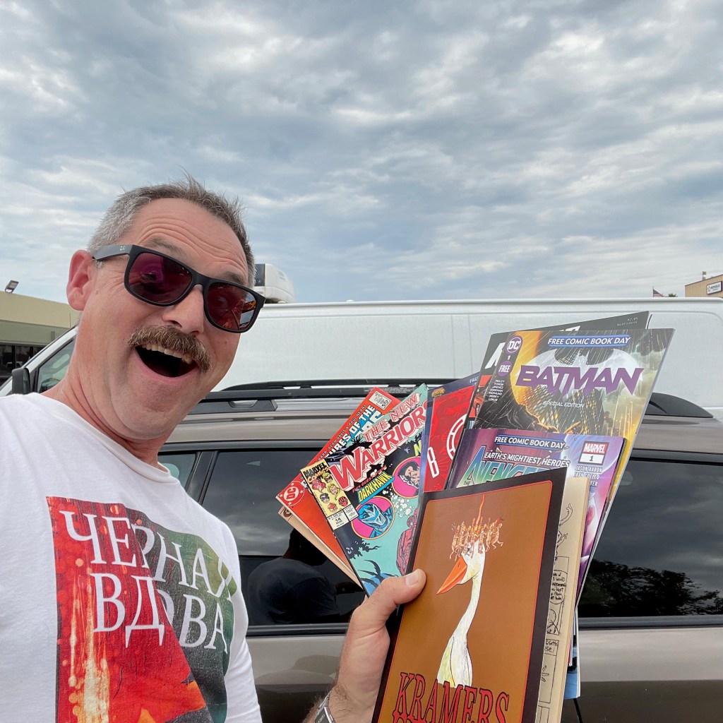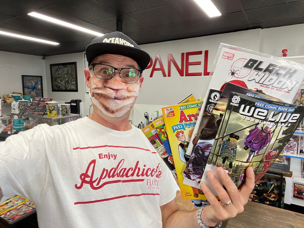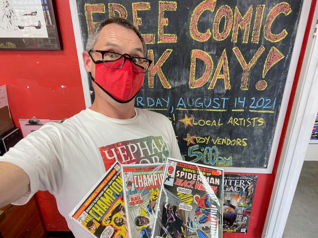 Displaced from the first Saturday in May, and erased in 2020 by the covid-19 pandemic, Free Comic Book Day this year is today, August 14! I decided to make a true day of it, recalling from past years that some comic book shops have strict limits on the number of free comics you can take home with you. Two years ago, my “home” shop, Comics-N-Stuff in Carlsbad, CA, instituted a hard and firm one-person-one-book rule. I pleaded with the clerk to let me choose two, since it was also my birthday, and he relented! Perhaps modest, but I decided to visit at least three stores in a few hours on a late-summer Saturday in San Diego, if for anything else to make up for the lost year–and the many, many lost years of Free Comic Book Day that I have endured, realized only too late (2013).