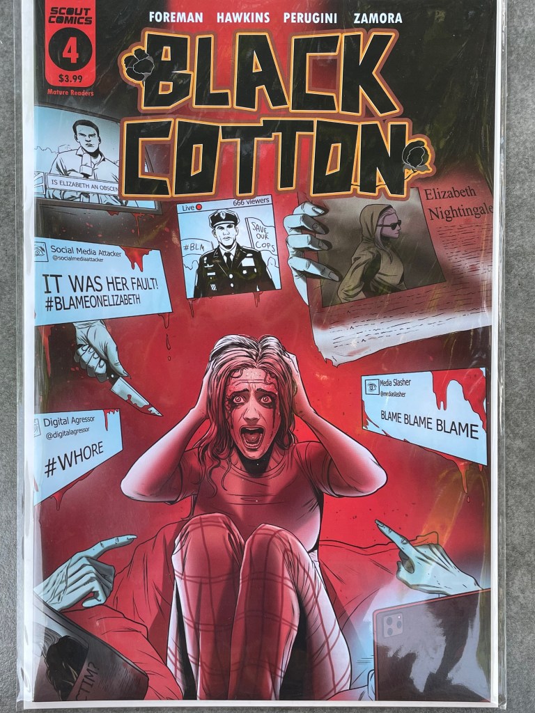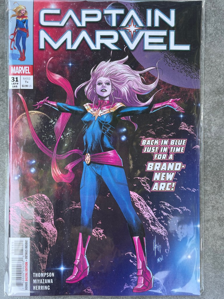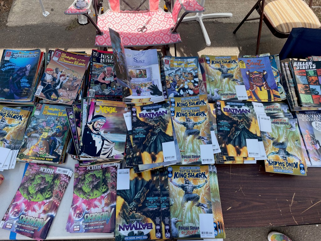 Well, this year, after a pandemic bye year, Free Comic Book Day continued and even grew in its bounty here in San Diego County. I began at CNS-Carlsbad shortly after opening. A pretty quiet day, considering. My most regular manager person was there. And I am so glad there is a “regular” to mention there; I got the VIP special, y’all. (OK, so I have a VIP card that I renew every year….) Three free comics for me from the rack of maybe three dozen behind the counter. And despite that this little perk is in part because I spend enough in that store to warrant it, I imagine, I allowed myself a sense of guilt at taking something for free without buying something, so I went to this week’s new comics rack and picked up Kelly Thompson‘s Captain Marvel #31. AND Black Cotton #4 was waiting in my file! In all honesty, I am most excited about the one thing I knew (or hoped–that pull list can be mighty iffy sometimes somehow….) was going to be there. Black Cotton is the shit. More on that awesome book in another post.